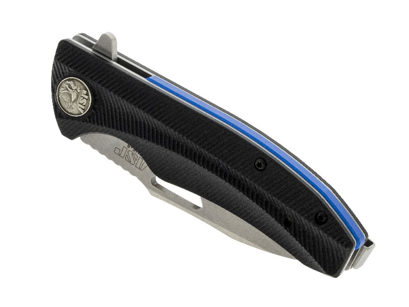 ASP Police Duty Knife (PDK) Classic Folder - Grooved - Stonewash. Sharp, fast and tough, the ASP Police Duty Knife (PDK) is built for the job. It's sure to become your new favorite EDC. The ASP PDK series of knives is the result of collaboration between law enforcement officers, ASP's product designers and knife engineering and manufacturing experts. Their goal was to create a practical, tough and dependable knife specifically for day-in, day-out police use. A tool of excellent quality, yet affordable for any officer. The ASP PDK features a 3.5" drop point "flipper" blade design with fast, positive assisted opening. The blade is crafted of highly corrosion-resistant, easy to maintain AUS-8 stainless steel, available in either a stonewashed or black PVD finish. A liner lock makes it safe and easy to release and close the knife. High-quality, textured G-10 scales (grip panels) provide a sure grip, and our signature Shark Fin™ jimping adds control when in use. ASP PDK knives feature our unique, quick-release pocket clip system. Reversing the clip for right- or left-pocket carry is as fast and simple as using the double lock pin on a handcuff key (not included) to release the clip lock, and snapping it into the slot on the other side. No tiny screws to use (or lose). Finishing touches include a Thin Blue Line tribute spacer in the spine of the knife, and a die struck ASP Eagle medallion mounted in the grip. ASP Police Duty Knife (PDK) Classic Folder Features: