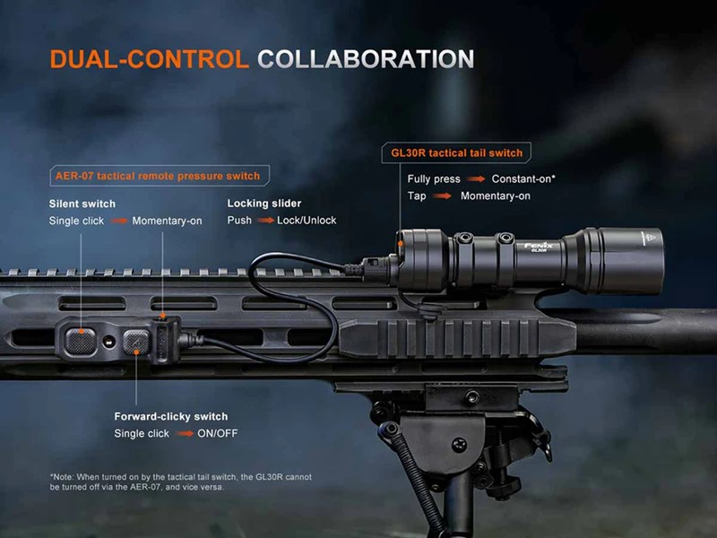 ![]() Fenix GL30R Weapon-Mounted Flashlight - 800 Lumens Lumens. The Fenix GL30R Weapon-Mounted Flashlight is the definitive all-in-one illumination solution for long-gun platforms. This comprehensive kit eliminates the guesswork of outfitting your firearm by providing a professional, mission-ready setup, including both Picatinny and Multi Rail Mount System mounting hardware. Despite its streamlined profile, the Fenix GL30R is a specialized long-range powerhouse, producing an incredibly intense 100,000 candela beam that reaches out to 2067ft (630m). Whether for tactical operations or specialized predator hunting, this light provides the extreme throw required to identify targets at distances reaching nearly 700 yards. Precision control is handled by the included AER-07 Tactical Remote Pressure Switch, which connects via a secure USB Type-C port featuring an anti-loosening lock to ensure a stable connection. The switch utilizes a patented dual-button interface for intuitive control of both momentary and constant-on activation. For added security, a mechanical locking slider prevents accidental activation during transport. The flashlight itself is constructed from A6061-T6 aluminum with a non-reflective, flat black matte finish, ensuring it stands up to the rigors of field use. Engineered for high-recoil environments, it features dual inner spring battery contacts to maintain stable lighting under fire. With integrated USB-C charging and an included ARB-L18-3400 V3.0 battery, the GL30R is a rugged, complete tactical system that is ready for deployment straight out of the box. Fenix GL30R Weapon-Mounted Flashlight Features: