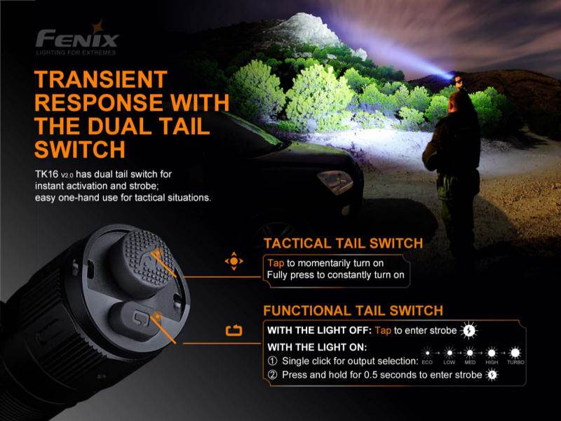 ![]() Fenix TK16 V2 Flashlight - 3100 Lumens. The Fenix TK16 V2.0 is a tactical flashlight featuring incredible performance by throwing a maximum 3100 lumens 1247 feet (380m). Quickly and easily operate the light, and choose between six lighting modes, by using the dual tactical tail switches. It's durable and rugged with an IP68 dustproof and waterproof rating, plus the stainless steel strike bezel includes tungsten steel breaking tips. Powered by an included rechargeable 5000mAh li-ion battery make the Fenix TK16 V2.0 flashlight your go-to tool for long-lasting tactical performance. Fenix TK16 V2 Flashlight Features: