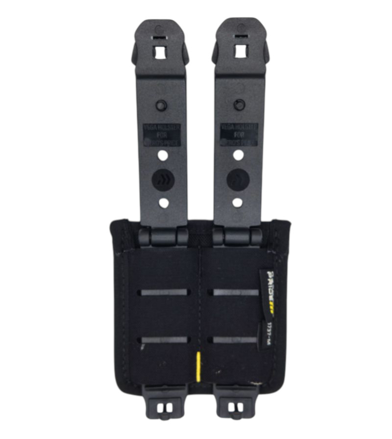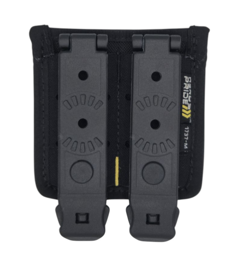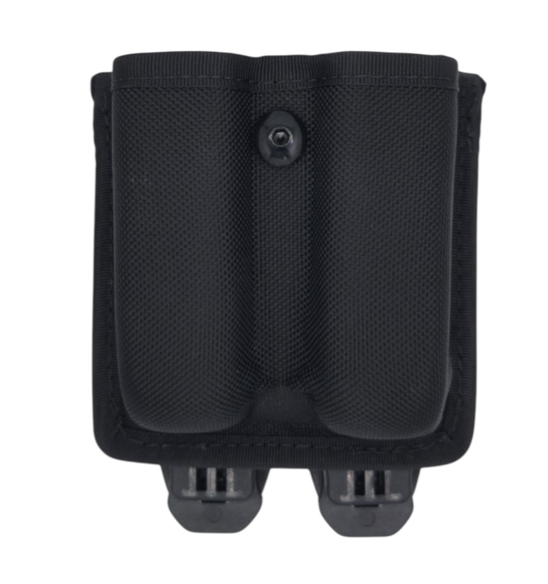Hero's Pride Ballistic Tac - Open-Top Magazine Pouch. This exceptionally-sturdy open-top double magazine pouch lightweight and brilliantly designed to function with both MOLLE vests and standard duty belts up to 2.25" wide. The rigid hinge clips easily thread through MOLLE panels and easily finction an secure clips for fastening to standard duty belts.
