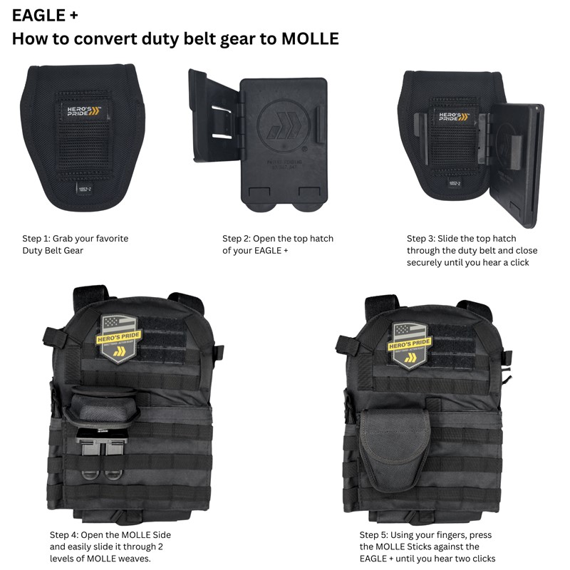 Hero's Pride Eagle+ MOLLE Converter. Turn your duty belt gear into MOLLE-ready gear in seconds'no tools, no weaving, no stress. EAGLE+ adds a new layer of flexibility to your existing kit. The EAGLE+ is a MOLLE conversion adapter designed to fit most 2.25" belt-loop nylon or Ballistic gear, allowing officers to mount their trusted duty belt pouches directly to MOLLE vests and carriers. Unlike the original textile-based Eagle adapter, EAGLE+ is a rigid, one-piece molded solution'faster to install, easier to use, and more durable in the field. Officers simply slide the EAGLE+ into the belt loop channel of their duty pouch, then push down to lock it. The integrated dual MOLLE sticks slide directly through MOLLE webbing'no weaving, no tools, no velcro. It's a cleaner, quicker way to convert and carry the gear you already trust. NOT compatible with Hero's Pride FLEX line or EDGE line products Hero's Pride Eagle+ MOLLE Converter Features: