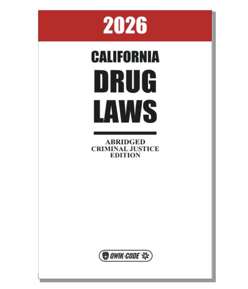 ![]() Qwik-Code 2026 California Drug Laws - Abridged. The Qwik-Code 2026 California Drug Laws Abridged book is a condensed and practical reference guide that provides an up-to-date overview of drug laws, regulations , and enforcement policies. It is primarily used by law enforcement officers, legal professionals, pharmacists, and compliance officers to quickly access relevant legal provisions without the need for a full statutory volume. Qwik-Code 2026 California Drug Laws - Abridged Key Features: