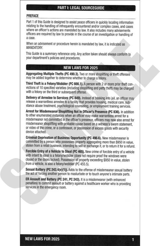 ![]() Qwik-Code 2026 CA Legal and Search & Seizure Field Sourceguide. The Qwik-Code 2026 California Legal and Search & Seizure Field SourceGuide by Devallis Rutledge is a practical, compact reference designed for law enforcement officers, legal professionals, and criminal justice students in California. This guide simplifies complex legal concepts into concise summaries, making it easier to navigate the state's search and seizure laws. Qwik-Code 2026 California Legal and Search & Seizure Field Sourceguide includes legal and technical summaries for: