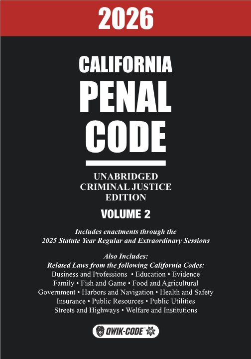 ![]() Qwik-Code 2026 California Penal Code Books - Unabridged-2 Vol Set. The Qwik-Code California Penal Code 2026 Unabridged is a comprehensive resource for anyone seeking the full text of the California Penal Code published. This is a "2 Volume" edition for all law enforcement, legal professionals, educators and students engaged in the California criminal justice system. These editions include the full, unedited text of the Penal Code, encompassing all sections, amendments, and legal provisions as they stood in 2025 by the Regular Legislative Session. Unlike the competition, the Qwik-Code 2026 California Penal Code Unabridged edition includes related laws from the following codes: Business and Professions, Education, Evidence, Family, Fish and Game, Food and Agricultural, Government, Harbors and Navigation, Health and Safety, Insurance, Public Resources, Public Utilities, Streets and Highways, Welfare and Institutions Importance for Legal Professionals For attorneys, law enforcement personnel, and legal scholars, possessing the unabridged edition of the Penal Code is crucial. It ensures access to the complete and most current legal framework governing criminal offenses and procedures in California, supporting accurate legal analysis, case preparation, and informed decision-making. Qwik-Code 2026 California Penal Code - Unabridged-Two Volume Set Key Features: