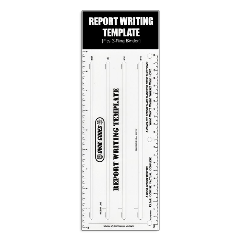 Qwik-Code Report Writing Template - LargeOur Price $17.10 | You Save 5% | Retail $18.00 ![]() Qwik-Code Report Writing Templates - Large. The Qwik-Code Report Writing Template is a durable plastic stencil that provides a structured framework to help organize and present information clearly, professionally, and logically. This template is designed for law enforcement personnel, academy recruits, students and other occupations where legibility is essential. This template is easy to use and also has a ruler to allow proper spacing for margins if necessary. The Qwik Code Report Writing Template allows users to deliver clear, legible and professional reports in a field where accuracy matters. Qwik-Code Report Writing Template - Large Features: