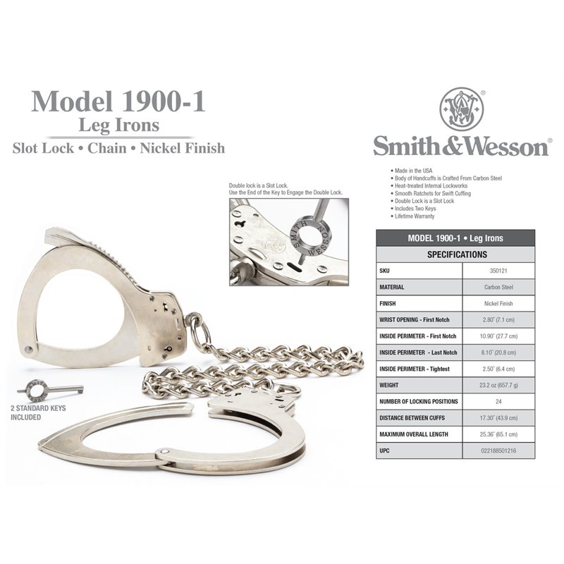 Smith & Wesson Leg Irons. Over-sized leg irons with 14-inch high-security heat-treated chain and larger dimension, elliptically contoured satin nickel cuffs. Smith & Wesson Handcuffs are fabricated from the finest quality carbon steel. They are manufactured with heat treated internal lockworks, featuring smooth ratchets for swift cuffing and double locks to prevent tampering. All S&W handcuffs meet or exceed demanding U.S. National Institute of Justice tests for workmanship, strength, corrosion and tamper resistance. Smith & Wesson 1900 Leg Irons Features: